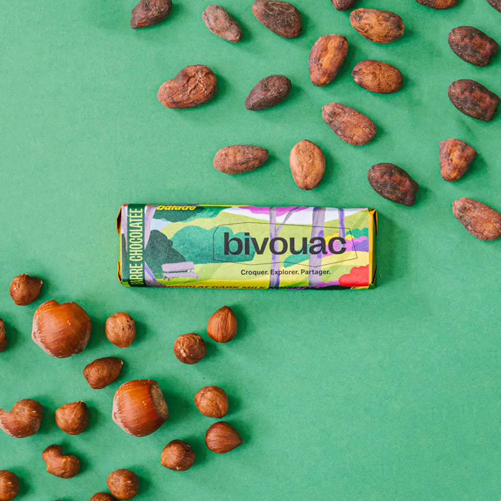 Barres, tablettes ou snacks : chaque recette Bivouac associe gourmandise et authenticité, pour des chocolats pensés comme des compagnons d’aventure et de partage.