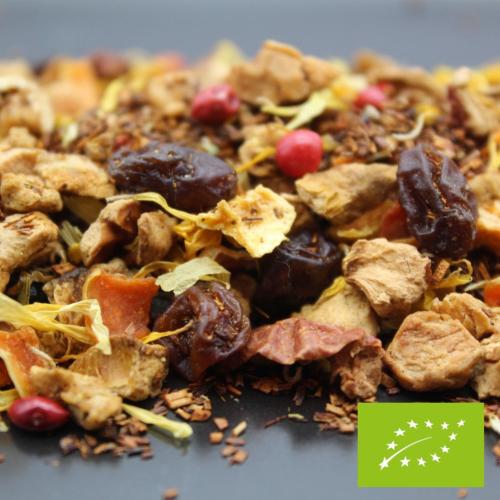 • Composition : morceaux de pomme, rooibos, raisins, carotte, arôme naturel, fleurs de souci, morceaux de pêche (2%), poivre rose
